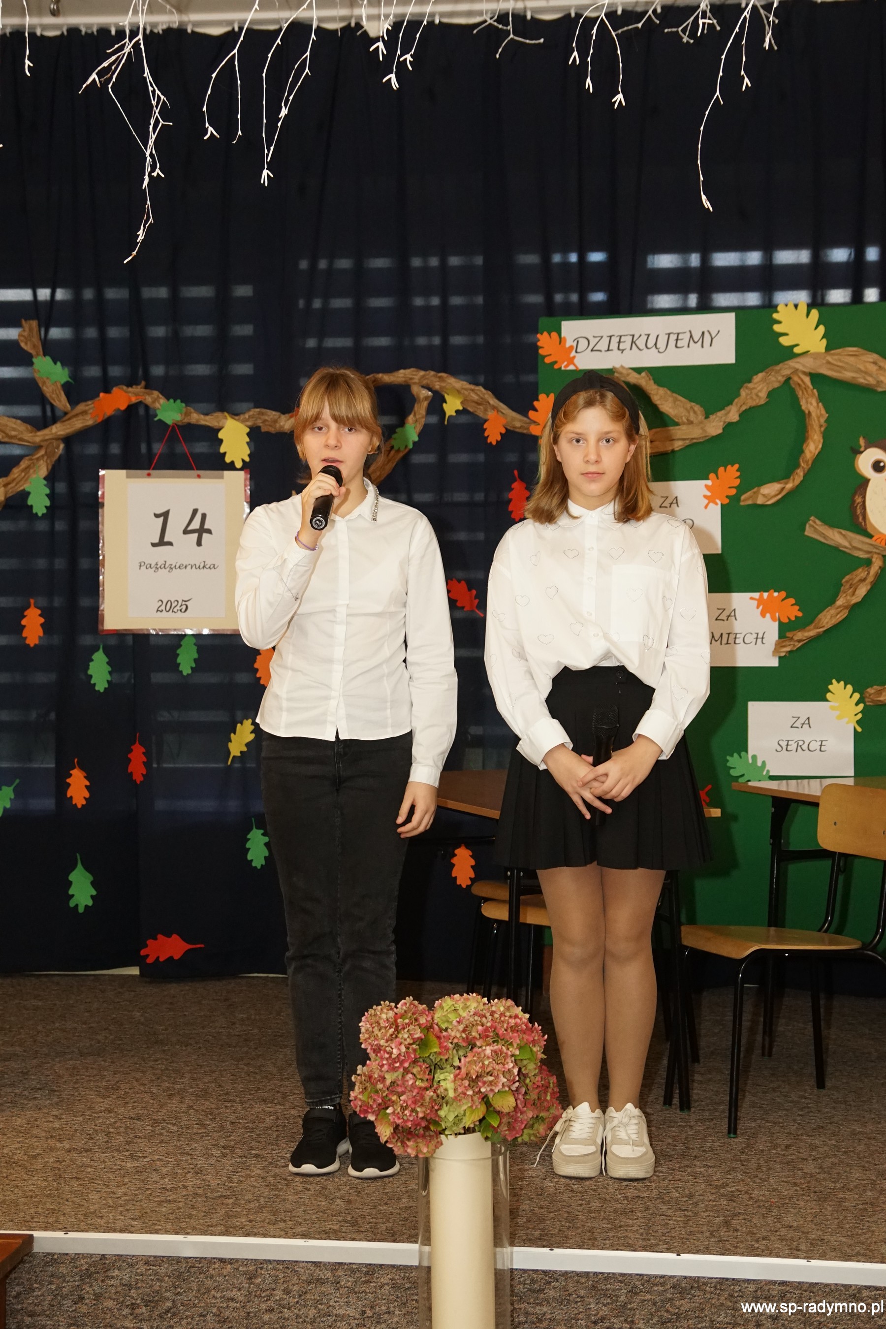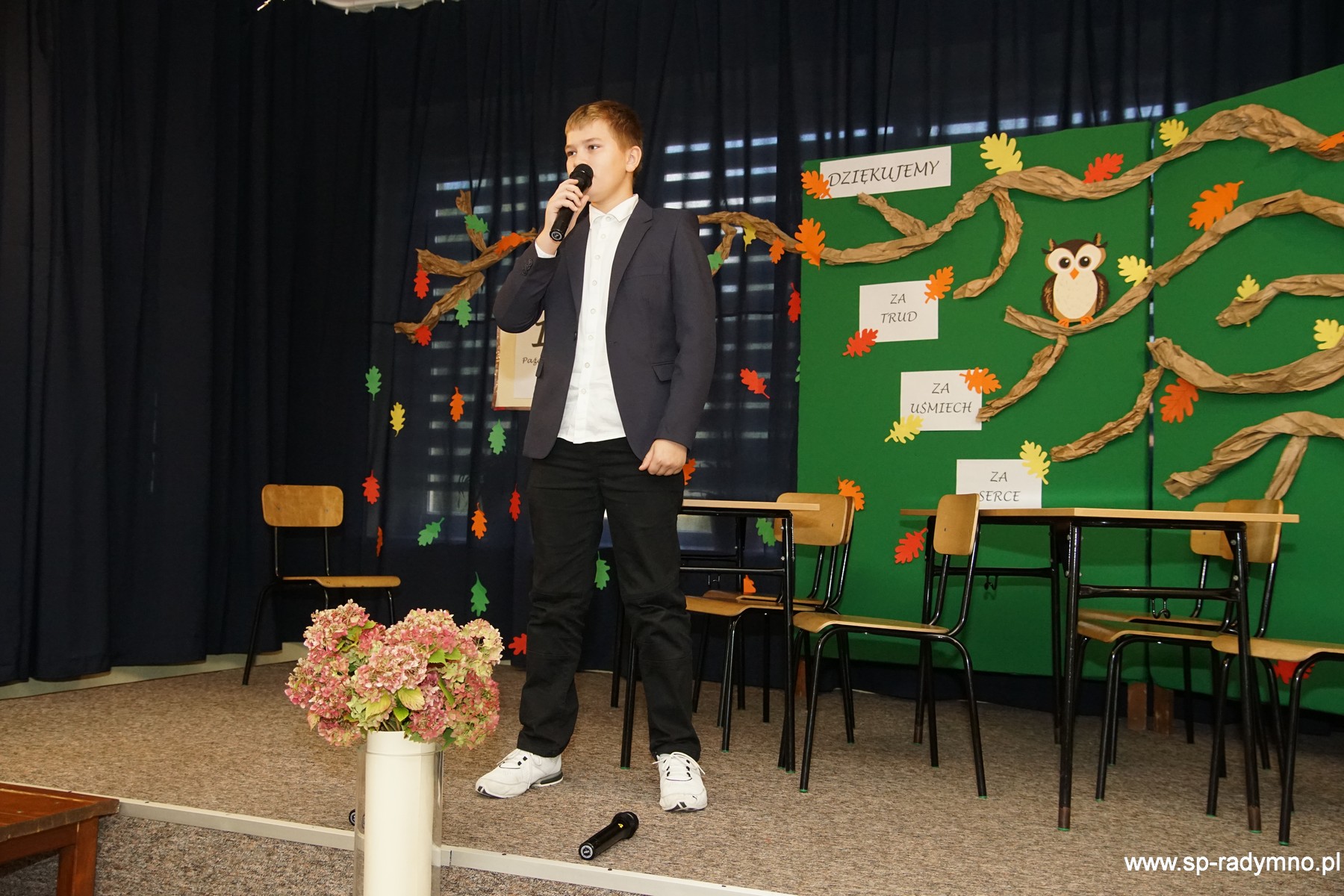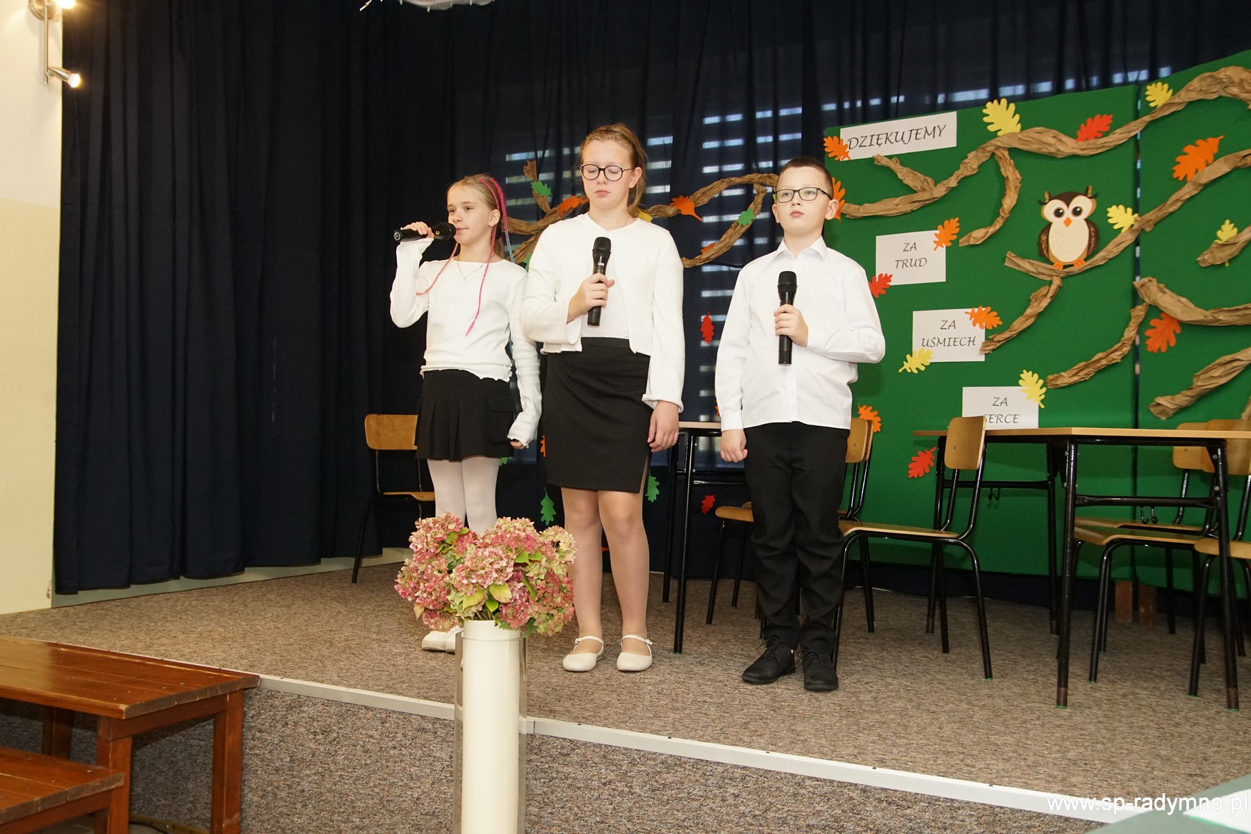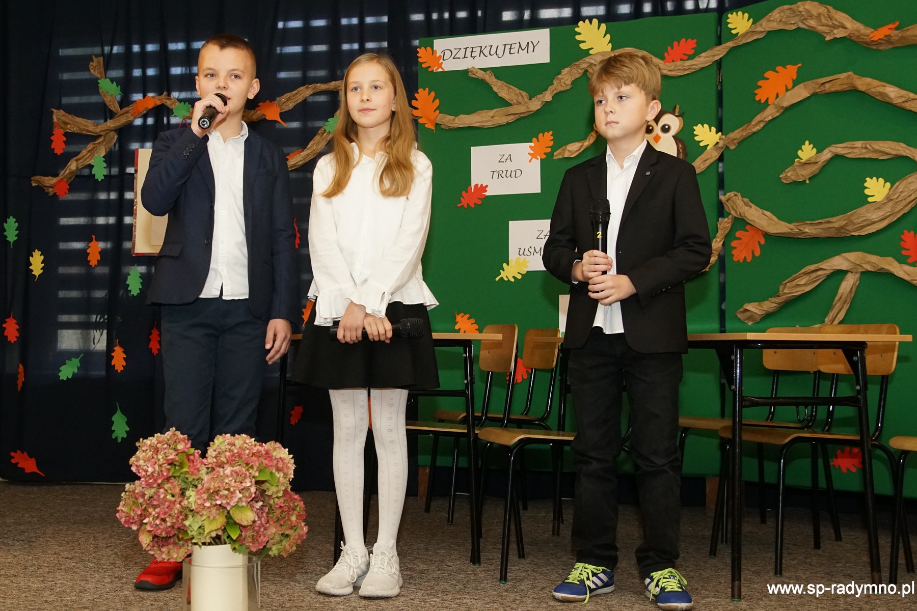 Życzenia, wiersze, piosenki, upominki i kwiaty towarzyszyły nam podczas tegorocznego Dnia Edukacji Narodowej. Uczniowie klas 4-6 pod czujnym okiem pani Ewy Brody, pani Elżbiety Koralewicz - Bagińskiej i pani Anny Pacek przygotowali akademię z okazji tego szczególnego dnia. Było wzruszająco, nostalgicznie i wesoło. Oprócz miłych słów od młodzieży grono pedagogiczne usłyszało życzenia od pana dyrektora Pawła Kalisza, pani sekretarz Zofii Kawałek oraz przewodniczącej Rady Rodziców pani Edyty Tancer. Samorząd uczniowski podziękował nauczycielom i pracownikom szkoły za ich pracę i serce. Dzień Edukacji Narodowej, zwany potocznie Dniem Nauczyciela, to święto całej społeczności szkolnej. To miły czas dla uczniów, nauczycieli i pracowników szkoły.