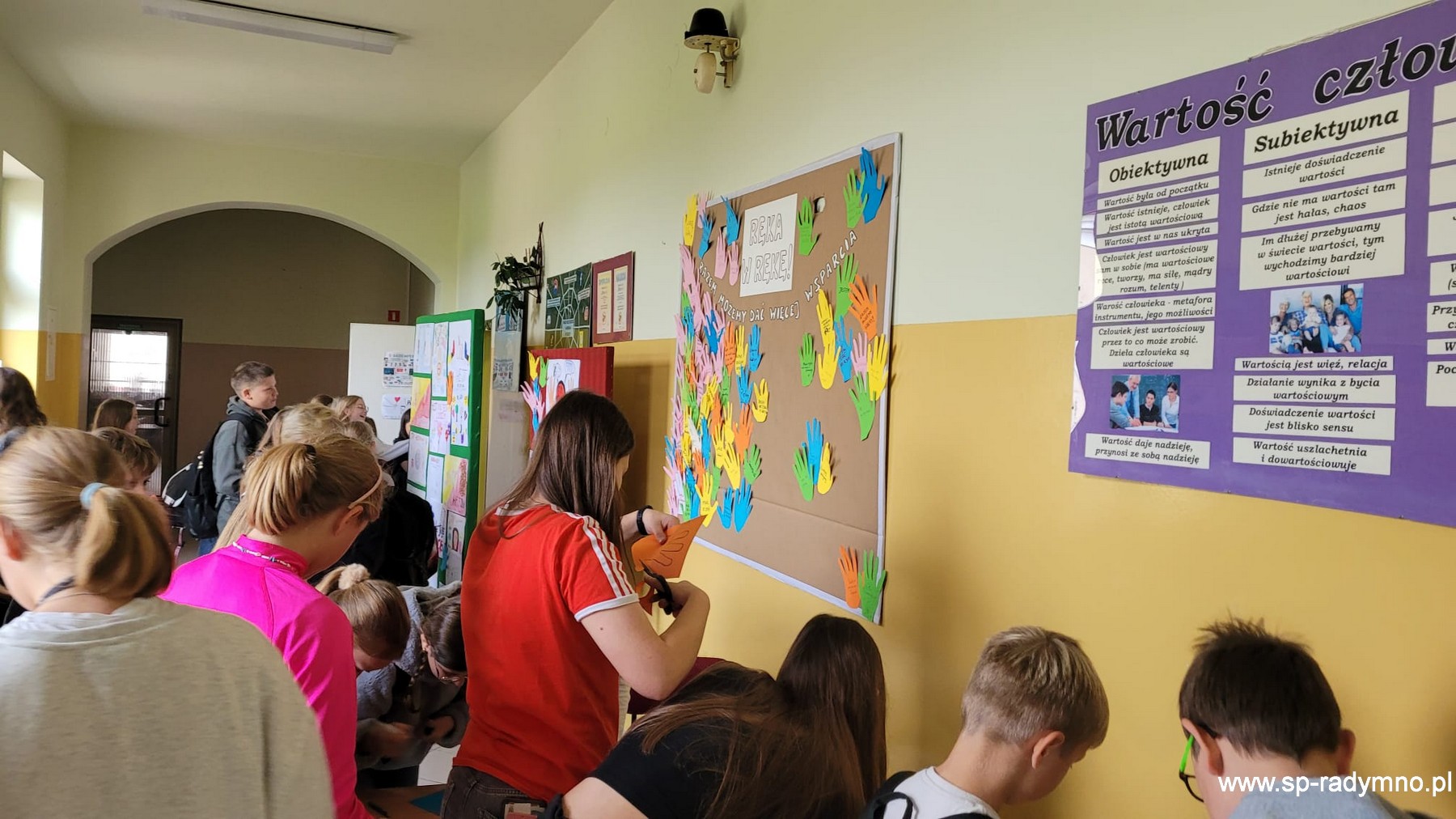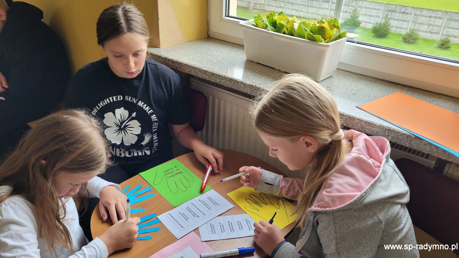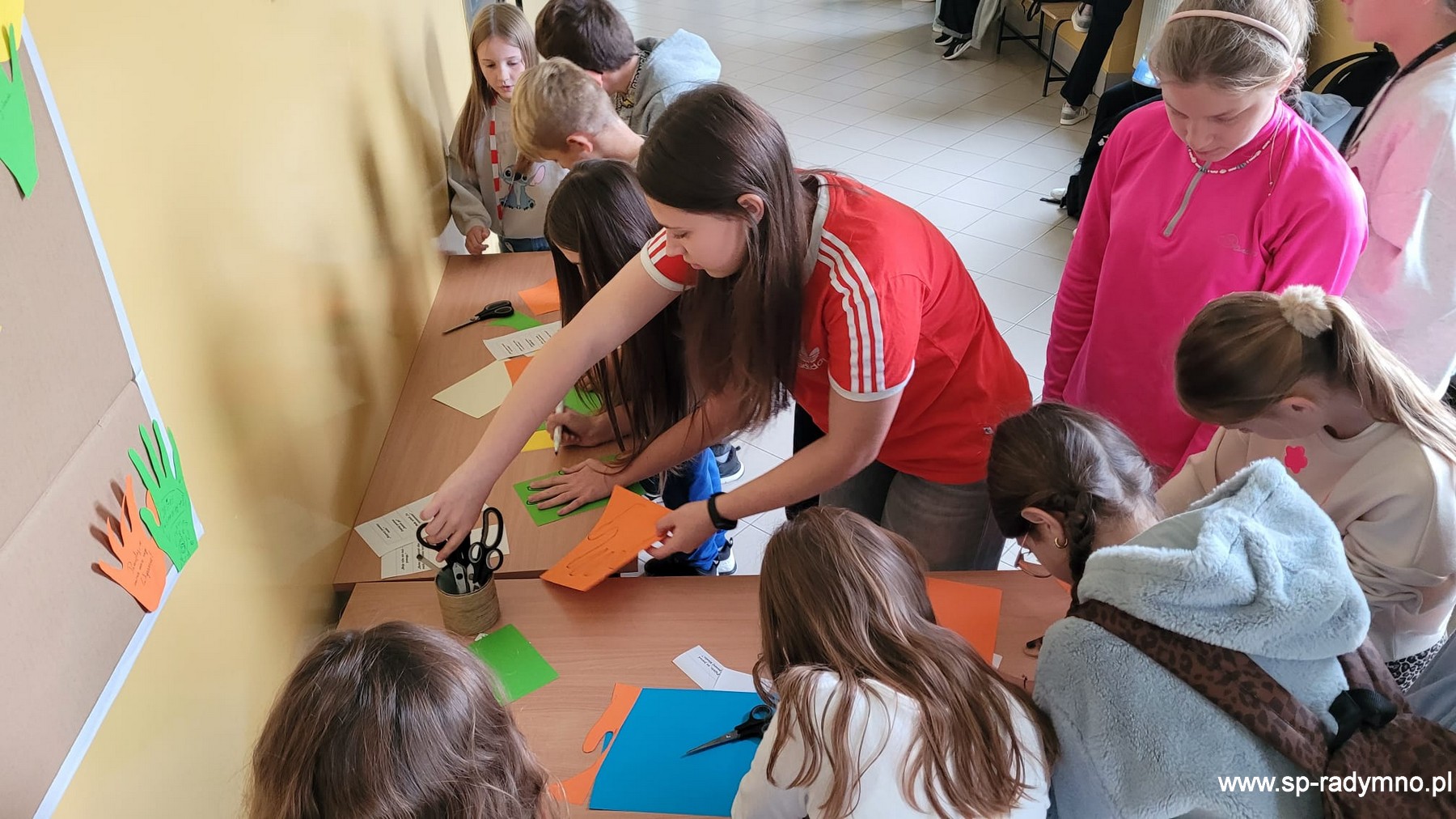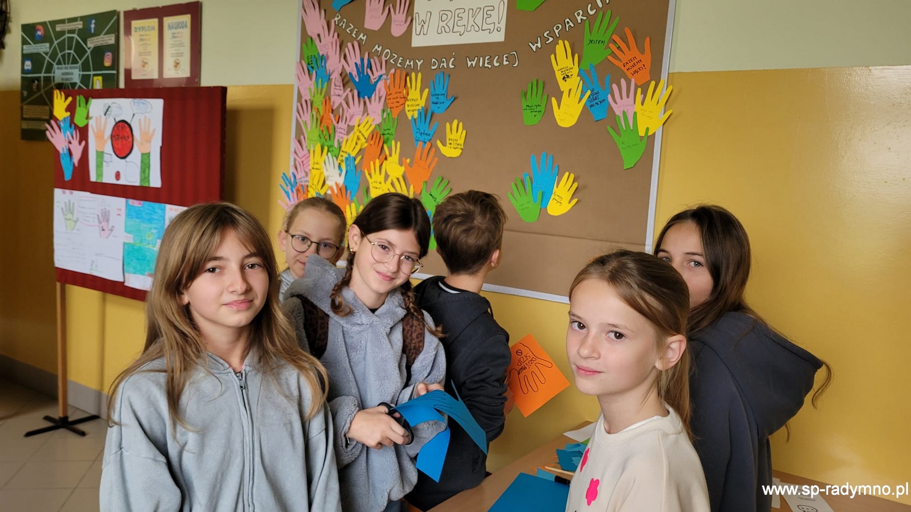 W piątek uczniowie tworzyli symboliczne „Miejsce dobrych rąk” – każdy odbijał swoją dłoń na papierze, wycinał i zapisywał na niej, w jaki sposób chce dawać wsparcie innym lub je otrzymywać. Powstała wspólne tablica symbolizująca wspólnotę, empatię i gotowość do pomocy.