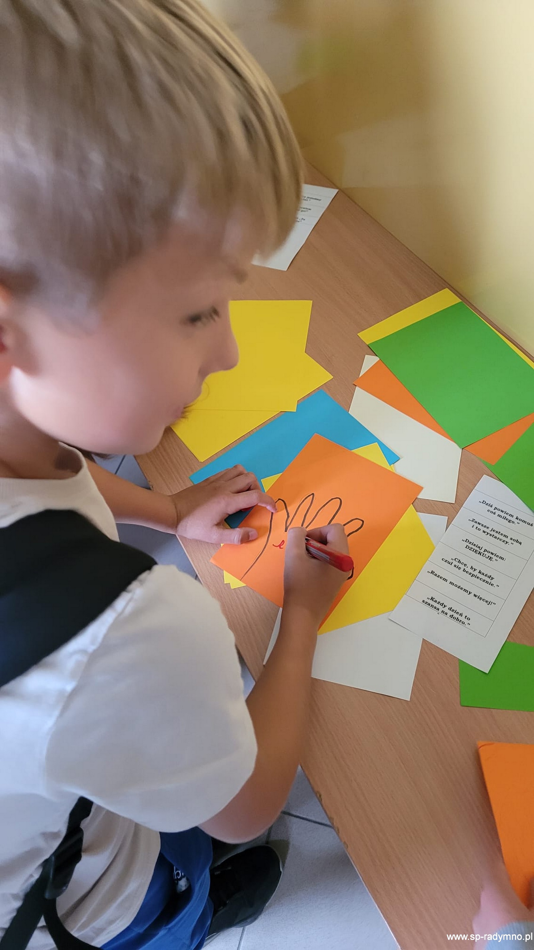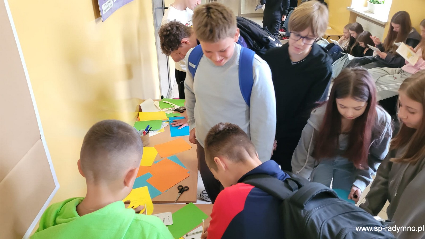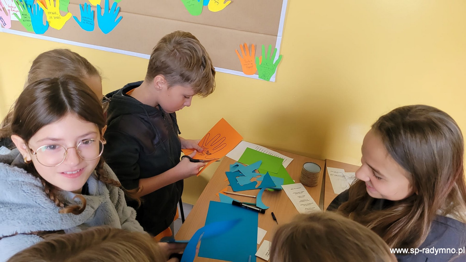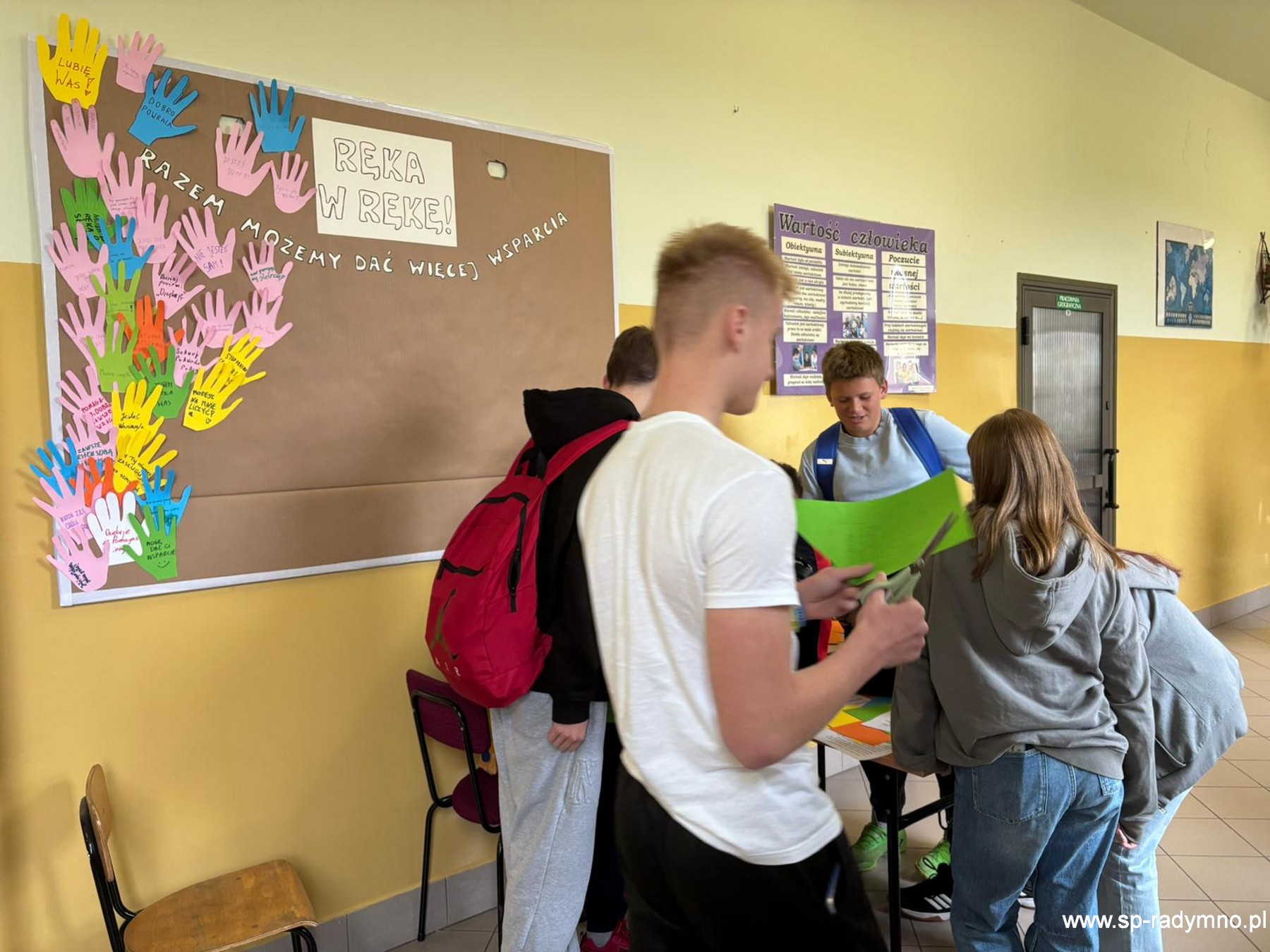 W piątek uczniowie tworzyli symboliczne „Miejsce dobrych rąk” – każdy odbijał swoją dłoń na papierze, wycinał i zapisywał na niej, w jaki sposób chce dawać wsparcie innym lub je otrzymywać. Powstała wspólne tablica symbolizująca wspólnotę, empatię i gotowość do pomocy.